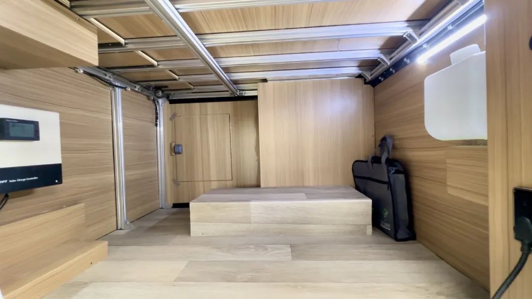 車上還有3000w的逆變器、800AH鋰電池、1200w太陽能板;200L的清水箱以及68L的灰水箱。