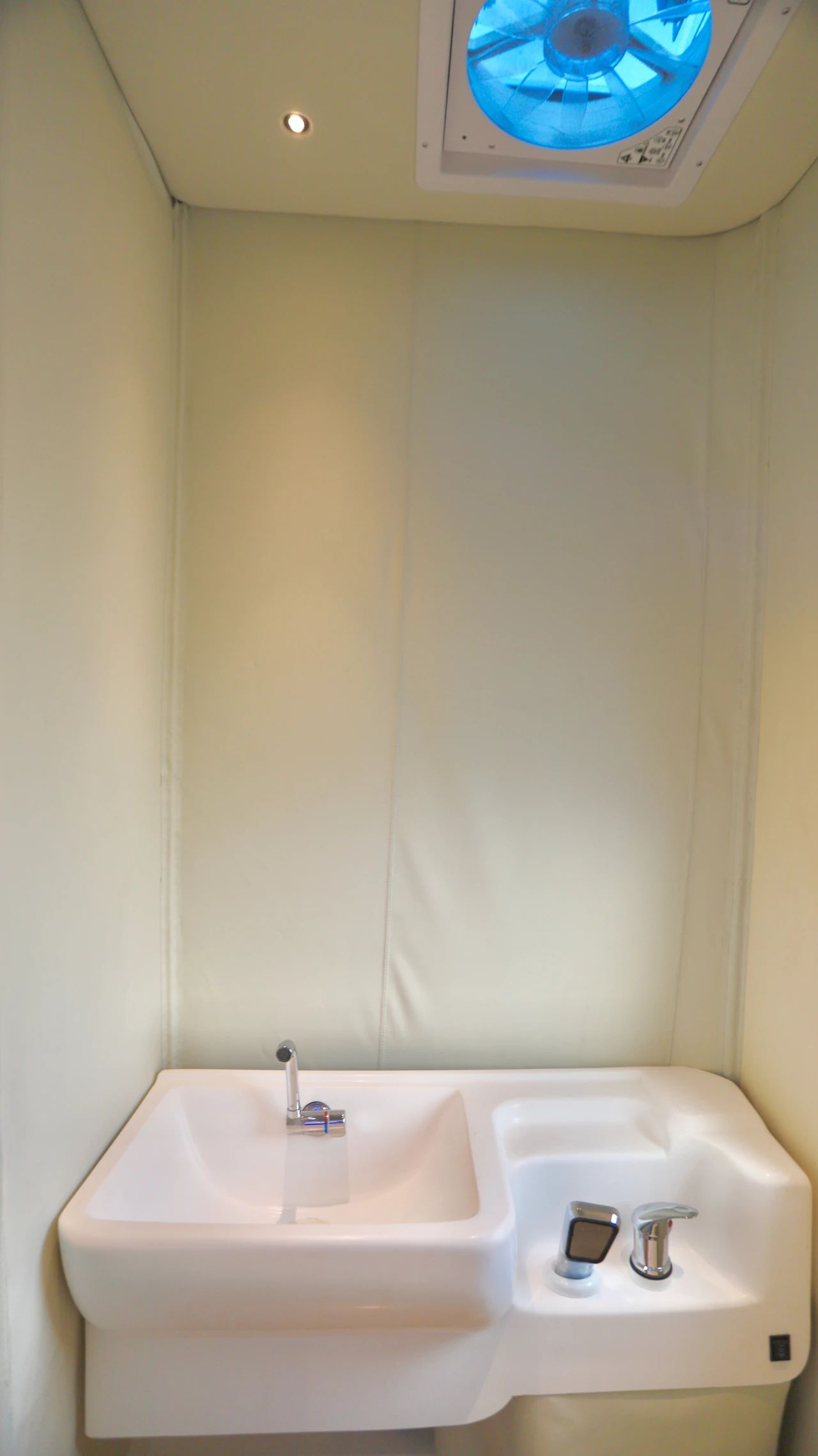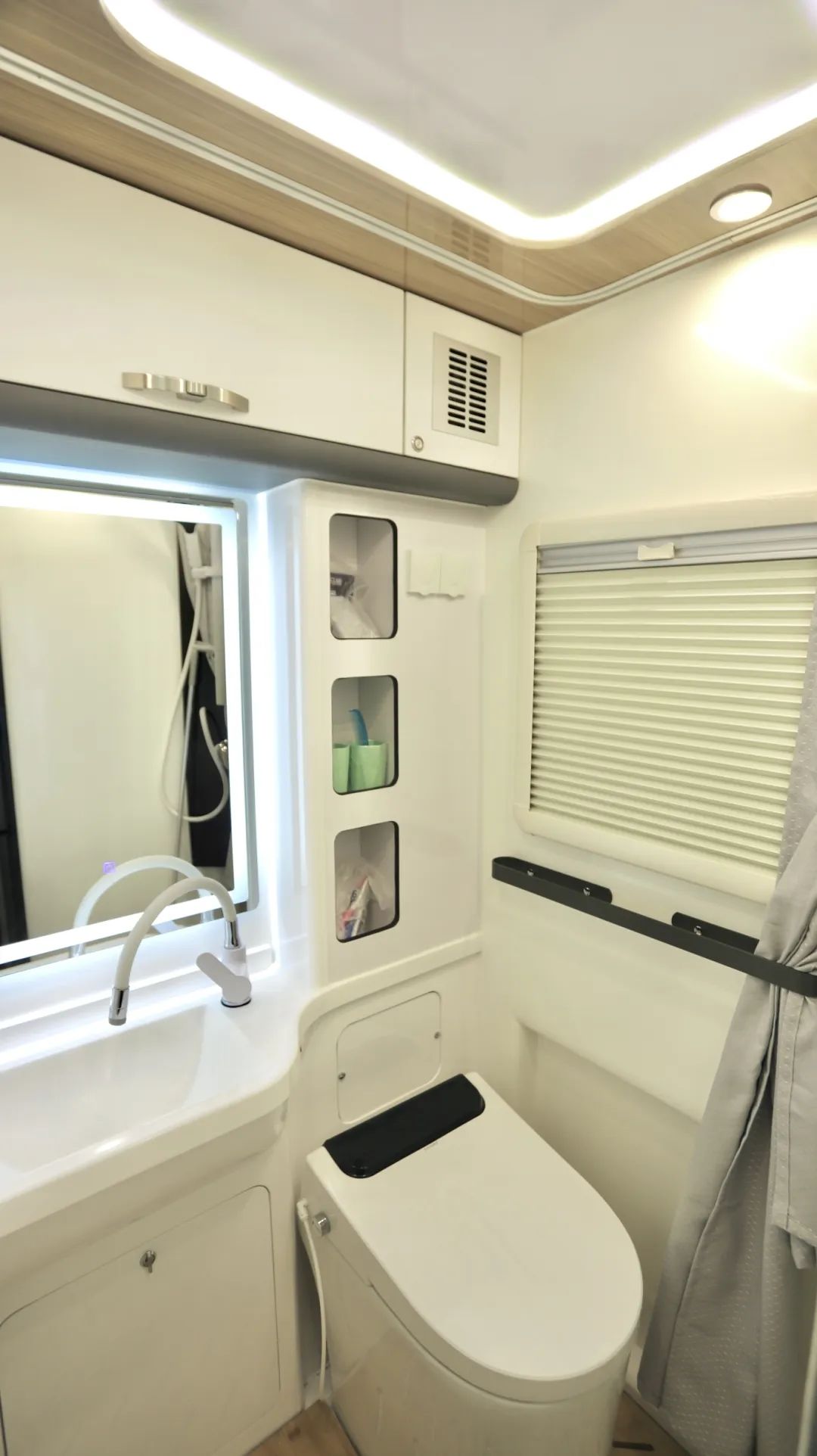 尾部衛(wèi)生間更加智能,電動(dòng)智能馬桶、上方智能觸摸屏浴室鏡,照明燈換氣扇以及五孔插座都做了防水處理,不用擔(dān)心洗澡濺上水。