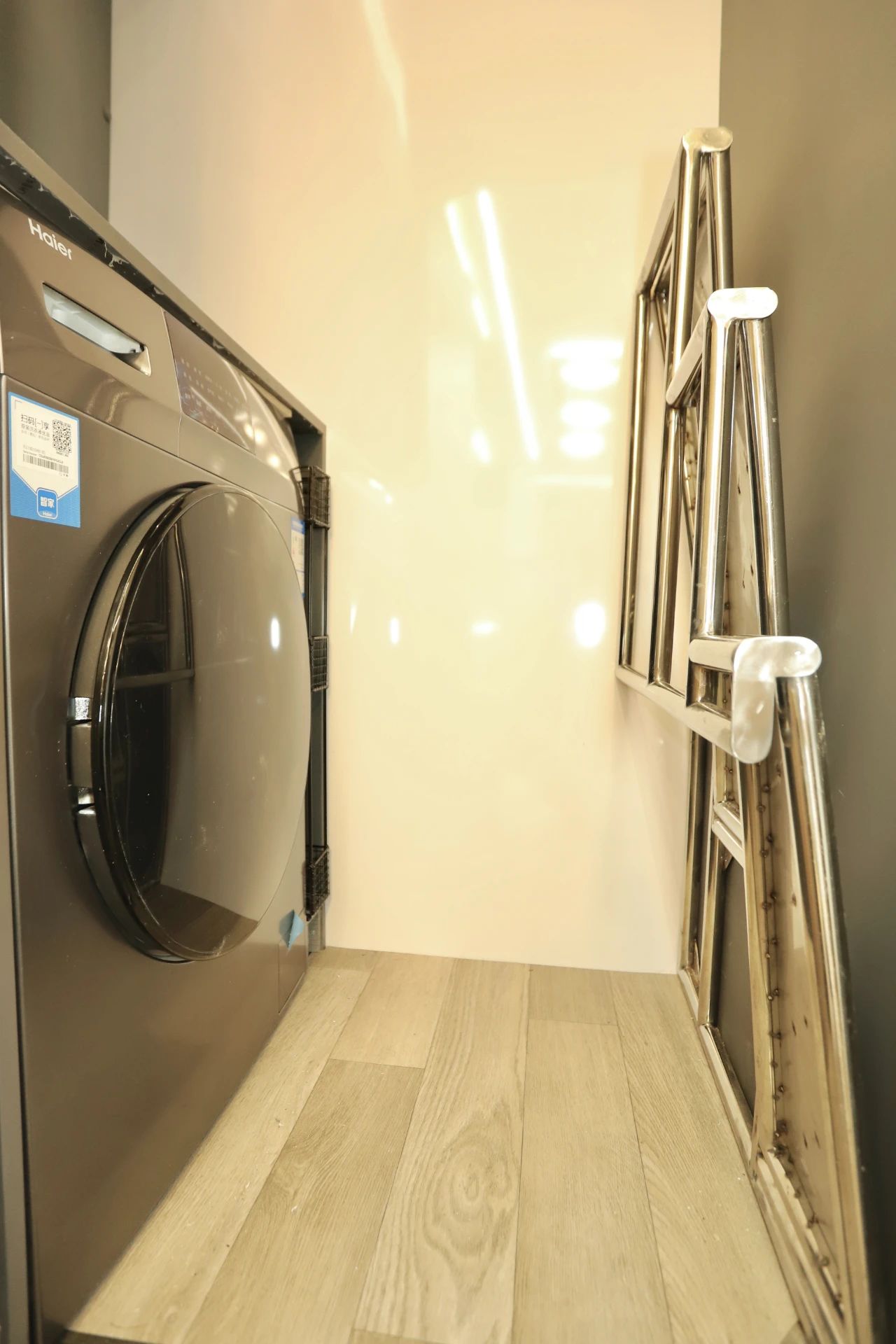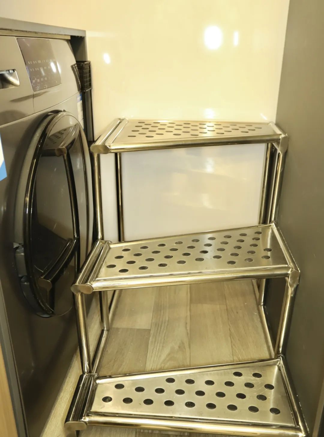 順著樓梯下來,就是一層的區(qū)域了,空間更加通透。旁邊為10公斤家用洗烘一體機(jī),別看現(xiàn)在不能用,將樓梯折疊就能正常使用了,上方的抽屜可以放洗衣液柔順劑,洗衣服的時(shí)候拿取超方便。