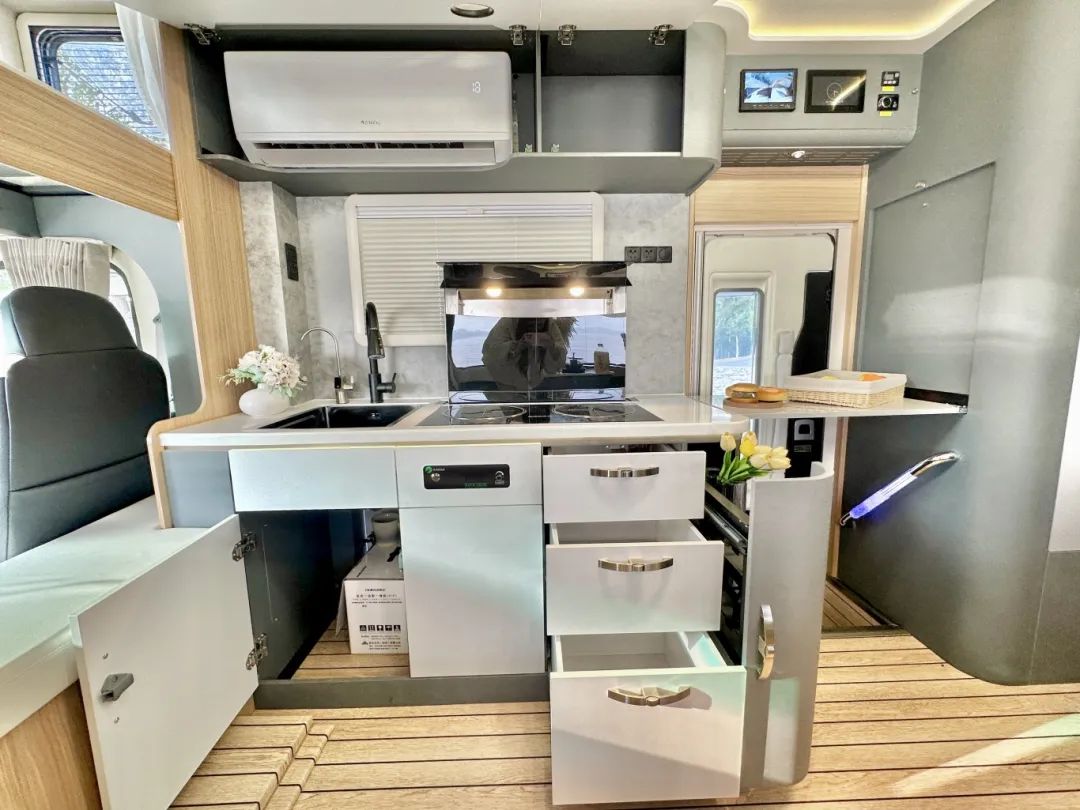 從S688采用的固定式的大餐桌1.0版本,到固定式吧臺(tái)可進(jìn)行拓展的2.0版本,再到現(xiàn)在可以完全隱藏在墻體一側(cè)的3.0版本,飛翔房車從未止步,為的就是讓大家旅居的生活更加優(yōu)質(zhì)。