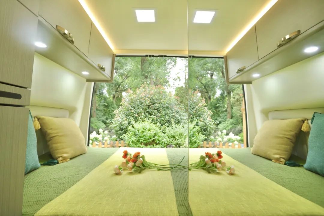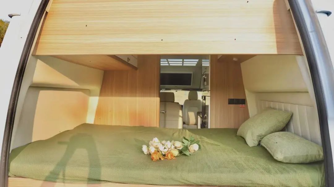 后置大橫床,隱私性極好,即使別人在外面也不會(huì)看到床的位置,尺寸可以達(dá)到1.3米×1.9米,一張雙人床,能滿足大部分人的睡臥需求的,在床頭和床尾也都安裝了吊柜,可以放置日常的換洗衣物;晚上睡覺(jué)再拉上隱私簾,這里就是一個(gè)私密的小空間。